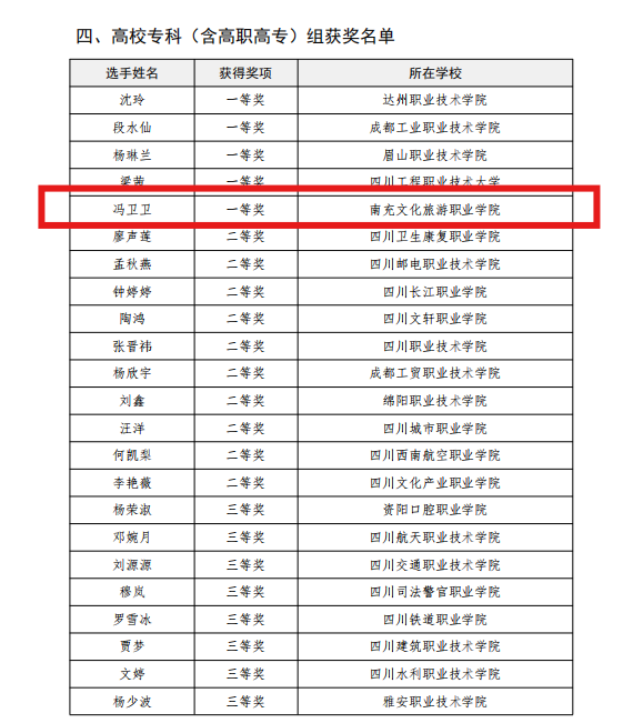 根据四川省教育厅《关于公布四川省大中小学国家安全教育教师教学竞赛结果的通知》(川教函〔2025〕250号),我校思政课教师冯卫卫凭借扎实理论功底、优质教学设计及出色现场展示,历经“高校选拔赛”“省级初赛”“省级决赛”三级选拔,最终脱颖而出,荣获全省大中小学国家安全教育教师教学竞赛高校专科(含高职高专)组一等奖。